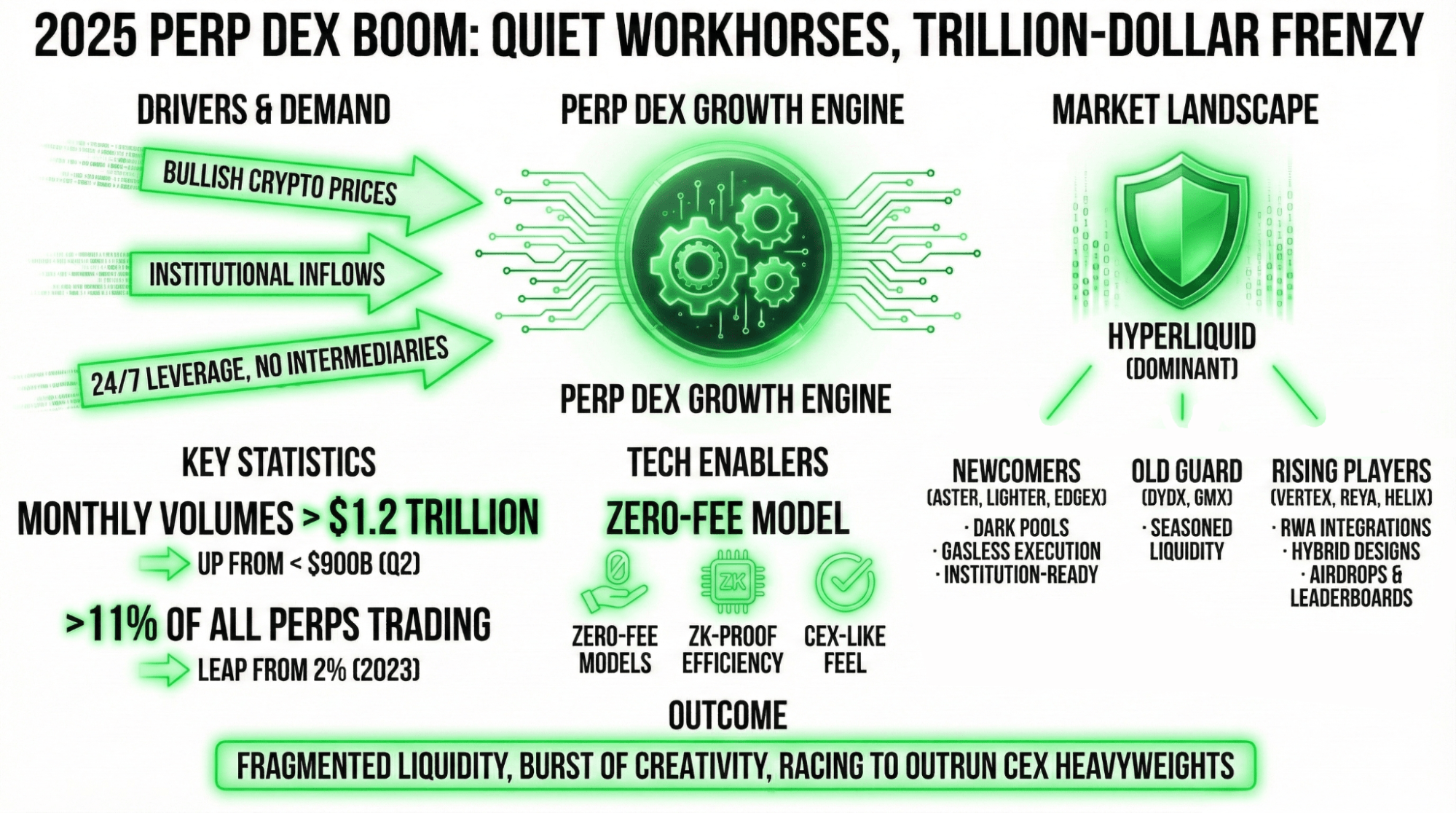 В захватывающей саге о криптовалютных трендах 2025 года бум Perp DEX украл шоу, превратив децентрализованную торговлю бессрочными фьючерсами в триллионный ажиотаж. Спрос взлетел, поскольку трейдеры устремились на эти платформы за круглосуточным кредитным плечом без посредников, чему способствовали бычьи цены на криптовалюты и приток институциональных средств, которые подтолкнули месячные объемы выше 1,2 триллиона долларов — по сравнению с менее чем 900 миллиардами долларов только во втором квартале. Этот всплеск, составляющий более 11% от всех торгов по перпетьюалам (скачок с 2% в 2023 году), был обусловлен технологическими прорывами, такими как модели с нулевой комиссией и эффективность zk-доказательств, которые сделали onchain-деривативы такими же гладкими, как платформы централизованных бирж (CEX). 🧠