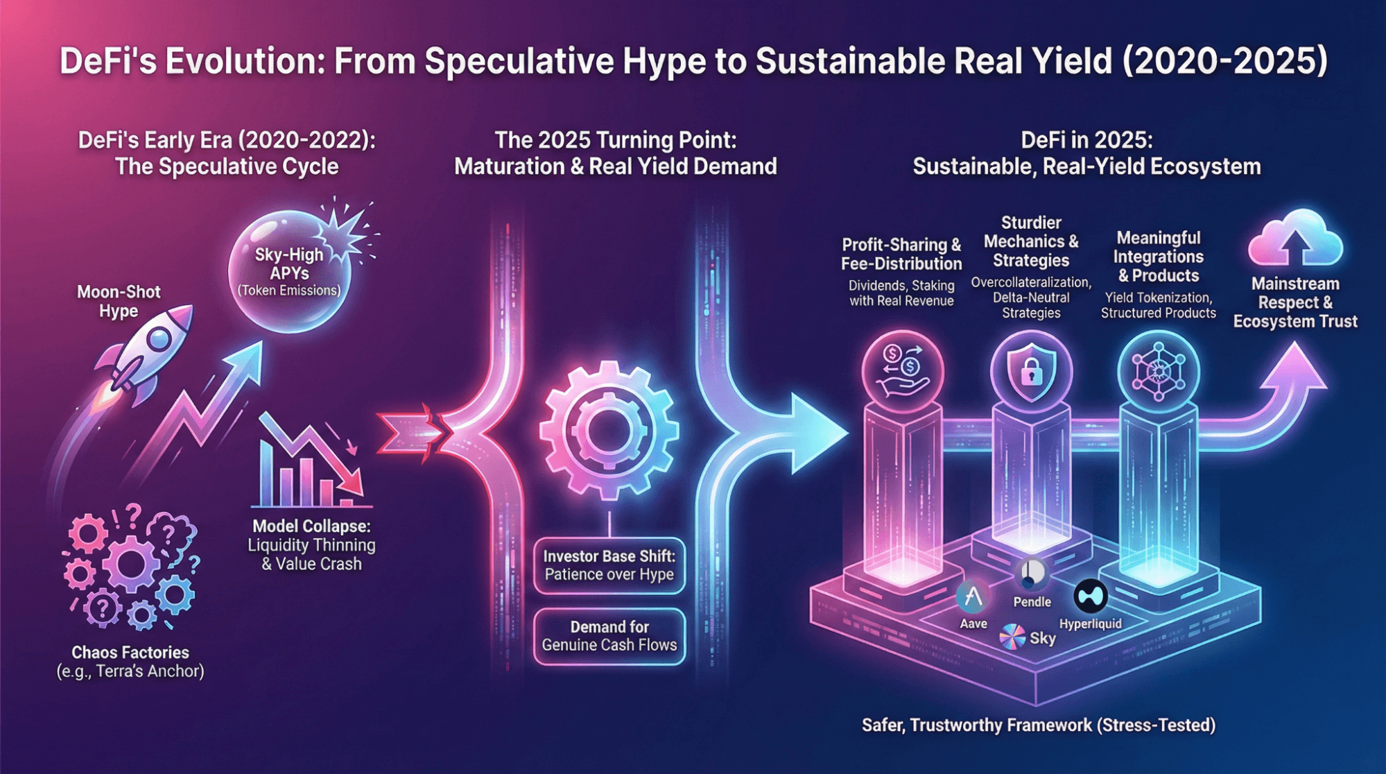 Ранняя эпоха DeFi (2020-2022) преследовала заоблачные APY от эмиссии токенов, но множество проектов развалились, потому что модель не сработала — инвесторы сбрасывали вознаграждения, ликвидность истощалась, и стоимость обрушивалась. К 2023 году «реальная доходность» взяла верх как нарратив, подчеркивая протоколы, которые распределяют реальные денежные потоки. 💰
