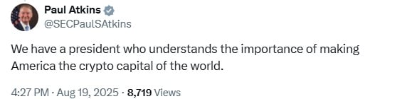 Регулятивная среда для цифровых активов в США вступила в решительно про-ростную фазу, поскольку Комиссия по ценным бумагам и биржам (SEC) переходит к ясности, инновациям и институциональному внедрению. Пол Аткинс, приведенный к присяге в качестве 34-го председателя SEC 21 апреля 2025 года, теперь возглавляет скоординированные федеральные усилия по позиционированию Соединенных Штатов как глобального центра цифровых финансов и рыночной инфраструктуры на основе блокчейна. 🧠💰